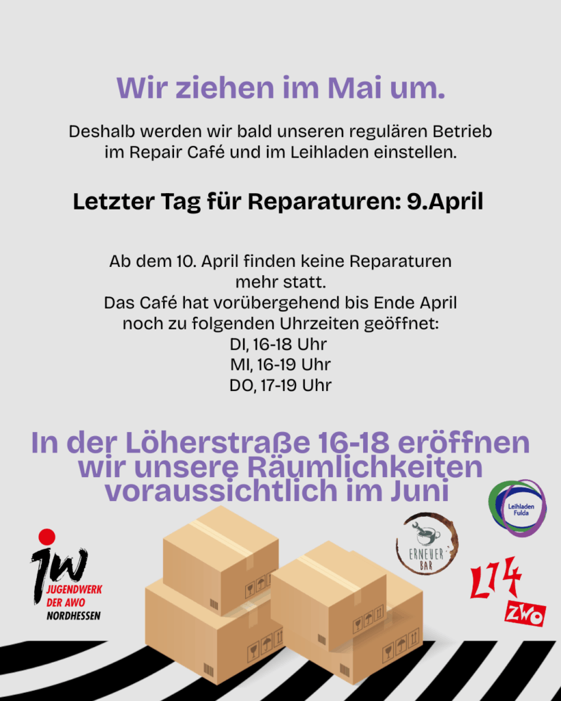 In der Umzugszeit sind wir weiterhin eingeschränkt erreichbar, neue Reparatur-Termine können aber erst wieder vergeben werden, wenn absehbar ist, ob wir unsere zeitlichen Ziele auch einhalten können.